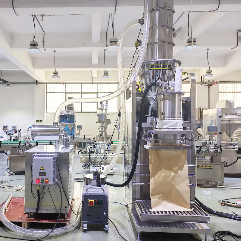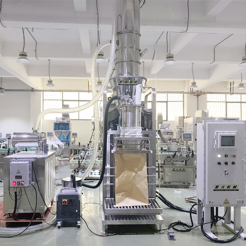 這款25公斤食品添加劑粉末包裝機(jī),是針對(duì)5-25kg敞口袋進(jìn)行設(shè)計(jì)的一款粉劑包裝機(jī)械,左邊是真空上料機(jī),右邊是防爆控制器,中間是粉劑包裝機(jī),這是個(gè)新款臥式雙螺旋25公斤粉劑整套包裝機(jī)。集機(jī)電光氣于一體,主要用于甜味劑、食品增稠劑、膨化劑、蛋白粉、面粉、淀粉以及微顆粒粉末的稱重包裝。