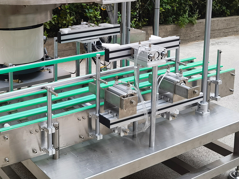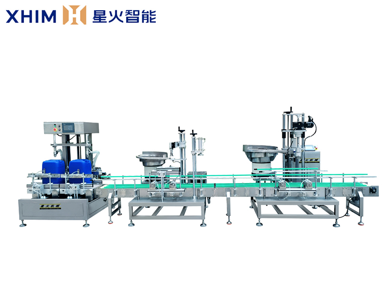 50公斤稱重灌裝生產(chǎn)線基于動態(tài)稱重反饋系統(tǒng)實現(xiàn)精準(zhǔn)定量,快速輸出等多個環(huán)節(jié)的灌裝,首先是進(jìn)料階段,物料通過管道進(jìn)入灌裝頭部分,自動化定量灌裝機在重力和壓力驅(qū)動下流入所需灌裝的大桶物料內(nèi),此時的高精度重力感應(yīng)器會根據(jù)充填進(jìn)容器內(nèi)的重量實時反饋,并將數(shù)據(jù)快速輸送至PLC控制系統(tǒng)的顯示屏幕內(nèi),讓用戶更加清晰查看生產(chǎn)過程,以及充填進(jìn)容器內(nèi)的重量變化,若重量未達(dá)到生產(chǎn)標(biāo)準(zhǔn),系統(tǒng)會控制灌裝頭以較大流量快速充填,在重量接近設(shè)定數(shù)值時,灌裝頭切換至小流量補料模式,確保灌裝精度控制在極小的范圍內(nèi),然后50公斤稱重灌裝生產(chǎn)線在感應(yīng)到重量達(dá)到目標(biāo)后,PLC系統(tǒng)立即發(fā)出指令,關(guān)閉灌裝閥門,停止物料輸送,并出發(fā)容器送至上蓋、壓蓋、旋蓋工位。