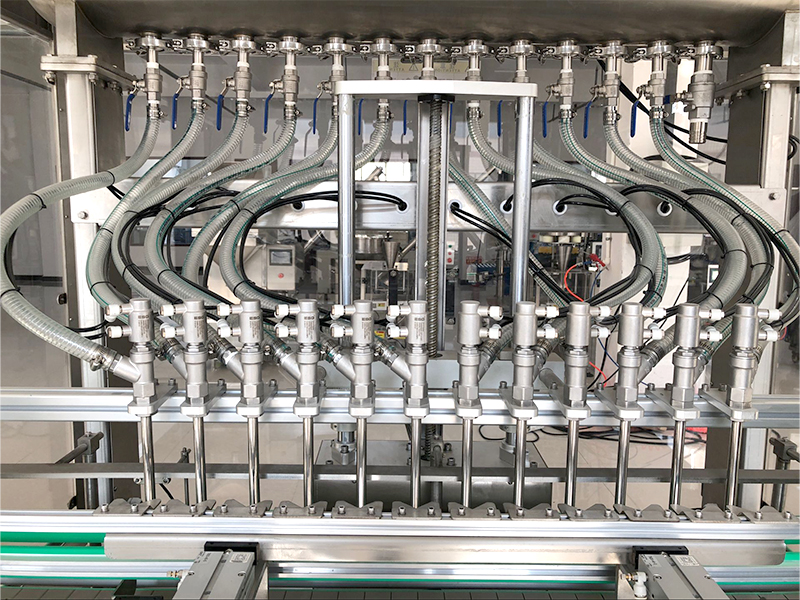 在進(jìn)入投產(chǎn)模式后,潤滑油自動灌裝機(jī)的儲料罐在輸送泵的作用下,通過食品級不銹鋼輸送管道,將雜質(zhì)過濾掉之后,穩(wěn)定的輸送至灌裝閥口處。當(dāng)光電傳感檢測檢測到與灌裝頭相等數(shù)量的容器后,將開始根據(jù)PLC控制系統(tǒng)內(nèi)的參數(shù)值相等的容器時(shí),開始對準(zhǔn)容器口進(jìn)行充填運(yùn)動,液體定量灌裝機(jī)生產(chǎn)線在充填的過程中,流量計(jì)會精確計(jì)量潤滑油流量,進(jìn)行定量灌裝。稱重反饋系統(tǒng)實(shí)時(shí)監(jiān)測容器內(nèi)潤滑油的重量,并將數(shù)據(jù)反饋給控制系統(tǒng),一旦重量達(dá)到設(shè)定值,灌裝頭立即關(guān)閉,停止灌裝,完成灌裝工作后,潤滑油自動灌裝機(jī)開始對各個(gè)容器進(jìn)行壓蓋工作,壓蓋的力度適中,既可以保證密封效果,又避免因用力過大損壞瓶蓋或容器。