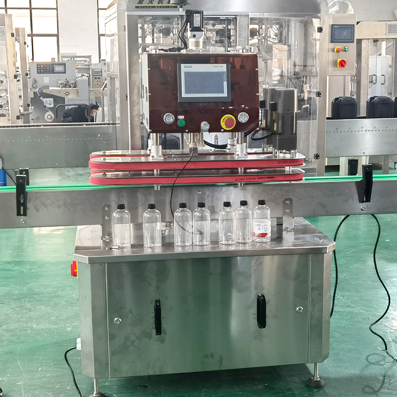 2、上蓋:采用夾瓶帶夾持瓶子,同步運(yùn)行套蓋,運(yùn)行時(shí)不會倒瓶。瓶蓋通過提升式理蓋機(jī)和導(dǎo)蓋軌道依次進(jìn)入掛蓋機(jī)構(gòu),完成自動上蓋。